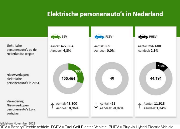 In Nederland rijden per november 2023 427.804 (334.186 per 31-01-2023) volledig elektrische auto’s (BEV - donkergroen) en 256.680 (192.247 per 31-01-2023) Plug-in hybrides (PHEV - zwart) rond. In deze infographic is voor de eerste keer ook het aantal voertuigen dat op waterstof rijdt, meegenomen. Dit zijn er in november 2023 609.