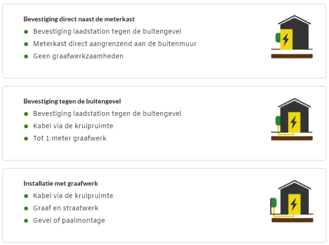 Als eerste is belangrijk dat je precies bepaalt waar je het laadstation precies geplaatst wilt hebben. Er zijn grofweg drie verschillende situaties: bevestiging direct naast de meterkast, bevestiging tegen de buitengevel of bevestiging op een laadpaal.